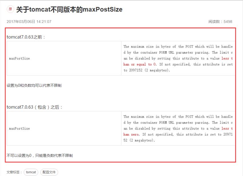 百度了下Tomcat maxPostSize這兩個(gè)關(guān)鍵詞,很幸運(yùn)的是第一條就是關(guān)于Tomcat不同版本的maxPostSize的設(shè)置,