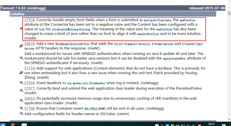 這里面是Tomcat7所有的歷史版本的變化,我們找到Tomcat 7.0.63版本,可以看到變化的第一項(xiàng)就是關(guān)于maxPost屬性的內(nèi)容,上面的博客的哥們果然是滿滿的干貨,雖然內(nèi)容少,但是一擊必中啊。