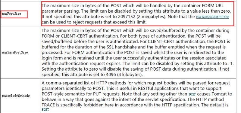 查看相關(guān)屬性,我們就會(huì)看到maxPostSize的詳細(xì)介紹,這個(gè)限制必須設(shè)置為小于0的負(fù)數(shù)才能不限制,缺省下是2097152,也就是2M的大小,單位是Byte。
