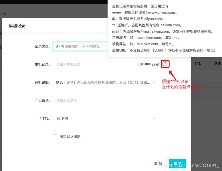 2、主機(jī)記錄。如果不懂,在這個(gè)選項(xiàng)后面有一個(gè)問號(hào),可以點(diǎn)擊查看主機(jī)記錄是什么意思,簡(jiǎn)單來說就是域名的前綴。