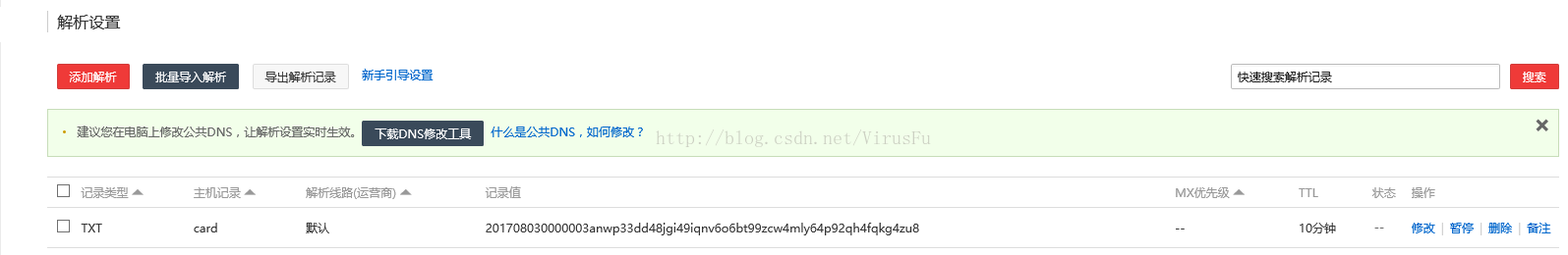 4).登錄到你的阿里云域名托管賬戶,找到你申請證書的域名添加下面信息,注意主機記錄和記錄值別填寫反了
