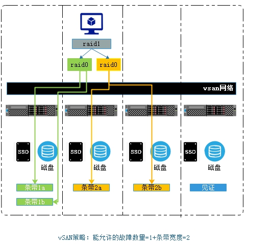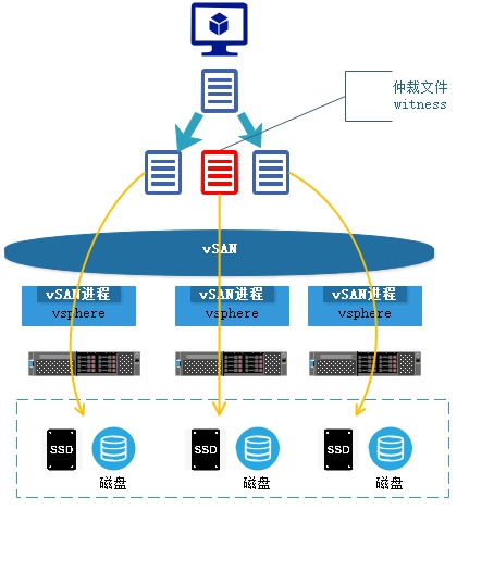 這個(gè)時(shí)vSAN最簡(jiǎn)單的架構(gòu),只允許一臺(tái)主機(jī)故障,只要故障發(fā)送在一臺(tái)主機(jī)內(nèi)