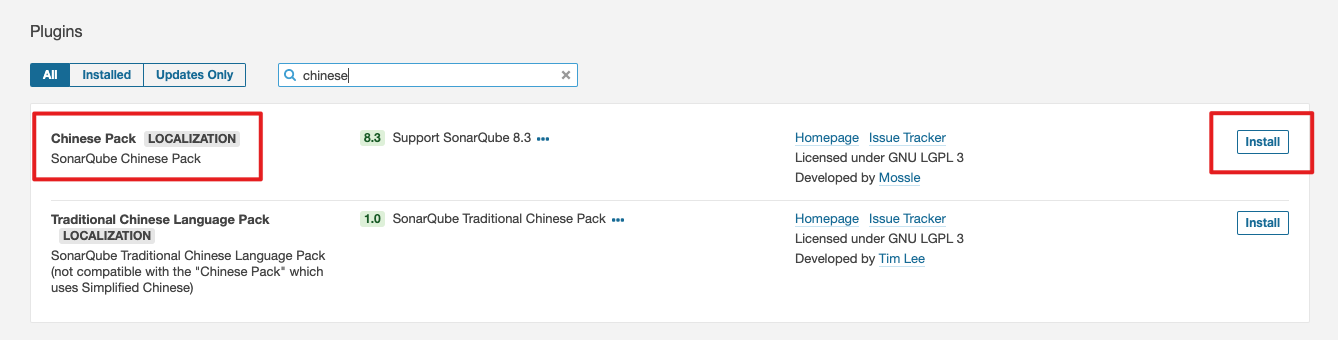 SonarQube提供了強大的插件管理功能,以中文語言包為示例,講解如何安裝插件: