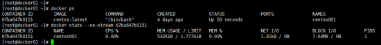 [root@docker01 ~]# docker stats --no-stream <容器ID>|<容器名稱> # 不是持續(xù)監(jiān)控,只顯示第一次返回的結(jié)果
