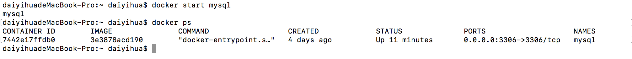 注意此時(shí)的容器名已經(jīng)變?yōu)閙ysql了,為關(guān)閉狀態(tài),再運(yùn)行鏡像時(shí)還是運(yùn)行不了,但此時(shí)再啟動(dòng)鏡像時(shí)就可以啟動(dòng)了