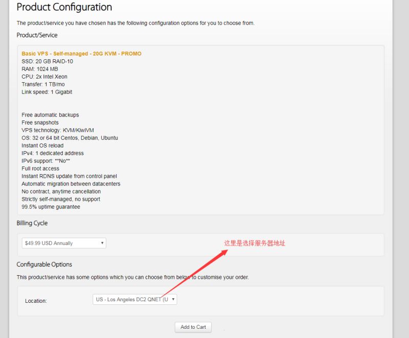 點Order,進(jìn)入購買詳情頁面,選擇服務(wù)地址,我選擇的是洛杉磯的,然后Add to Cart