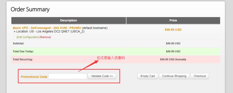 然后進(jìn)行購買結(jié)算,輸入優(yōu)惠碼:BWH26FXH3HIQ- 6.25%(這個最低目前) 然后點右下角Checkout 進(jìn)行購買