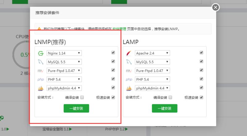 登錄后,會彈出一個窗口提示我們安裝web環(huán)境,這里我選擇安裝推薦的LNMP環(huán)境。