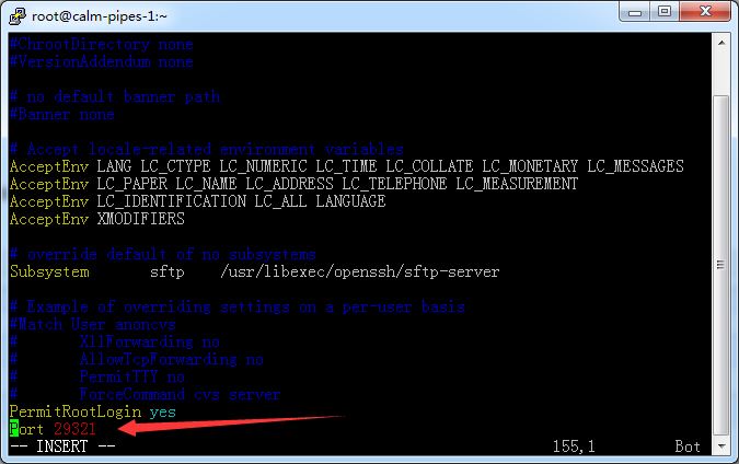 然后執(zhí)行命令打開了SSH配置文件,按一下“i”鍵進(jìn)入insert模式,然后按“↓ ”到最下面找到Port