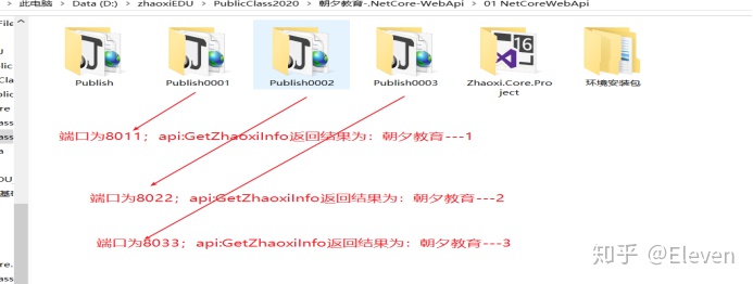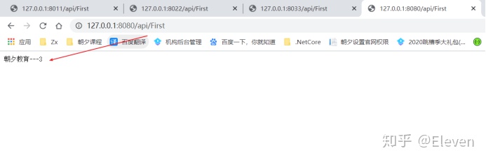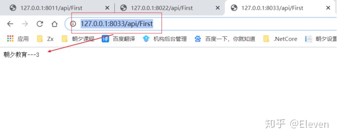 3.此時就可以使用Nginx配置負載均衡了,我先啟動多個WebApi服務器,運行起來,每個服務器的同一個接口返回的數據略有不同;第一個服務器的接口我返回的數據為:朝夕教育---1,第二個服務器的接口返回的數據為:朝夕教育---2,第三個服務器的接口返回的數據為:朝夕教育---3;三個服務器啟動后的的端口分別為:8011,8022,8033;也就是說8011端口返回的是:朝夕教育---1 ;8022端口返回的是:朝夕教育---2;8033端口返回的是:朝夕教育---3;也就是說三個服務器代碼一樣的,這里返回的結果不一樣,是為了能夠測試區(qū)別。