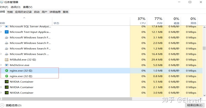 2.啟動Nginx:直接到下載的Nginx包中雙擊打開“nginx.exe”即可,也可以通過命令啟動;命令啟動此處不詳解;啟動以后,打開任務管理器,會發(fā)現任務管理器中會有Nginx服務;