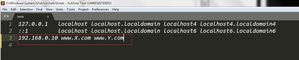在客戶端上更改/etc/hosts文件,讓其訪問(wèn)www.X.com 和www.Y.com 能夠解析到遠(yuǎn)程主機(jī)