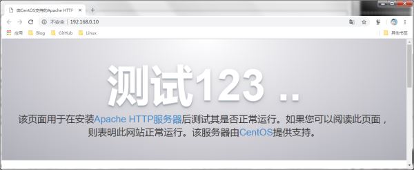 提示:從ansible-playbook 對(duì)playbook的執(zhí)行狀態(tài)來(lái)看是成功了,接下來(lái)我們直接使用瀏覽器來(lái)訪問(wèn)192.168.0.10,看看httpd是否已經(jīng)能夠正常訪問(wèn),如果能正常訪問(wèn)說(shuō)明httpd已經(jīng)安裝好了