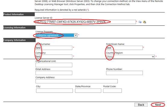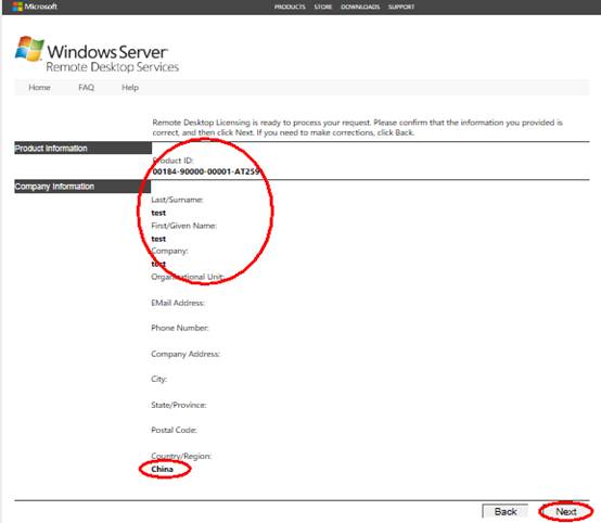 2.5 在下面界面中,輸入“產(chǎn)品ID:00184-90000-00001-AT259”,按下圖填寫所需信息后,點擊下一步。
