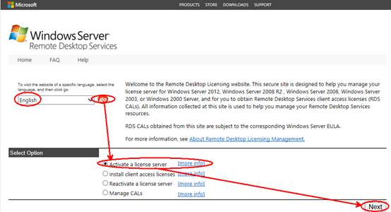 2.4 在Internet Explorer瀏覽器地址欄中輸入https://activate.microsoft.com,點擊GO ,開始注冊并獲取服務(wù)器許可密碼向?qū)?。確保已選中“啟用許可證服務(wù)器”項后單擊"下一步"按鈕。