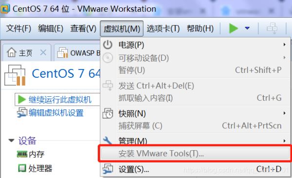 2.如圖打開虛擬機,點擊安裝vmtools選項 (如果安裝vmtools像下圖一樣為灰色,見圖2關閉虛擬機,在虛擬機設置CD/DVD和軟盤為自動檢索再重啟就可以了)