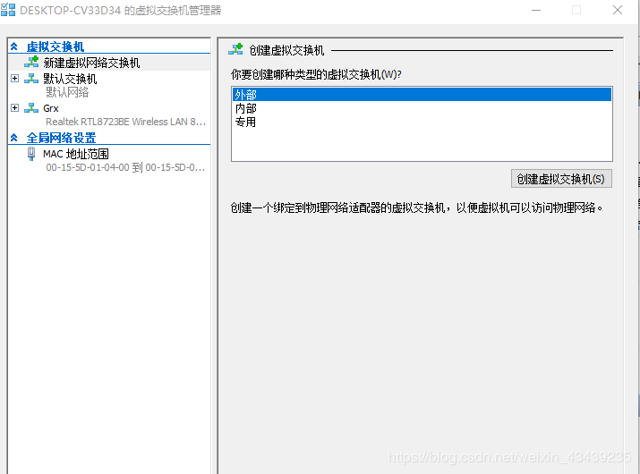 2. 選擇“新建虛擬網(wǎng)絡(luò)交換機”,在虛擬交換機類型列表中選擇“外部”,點擊“創(chuàng)建虛擬交換機”,創(chuàng)建一個虛擬交換機。