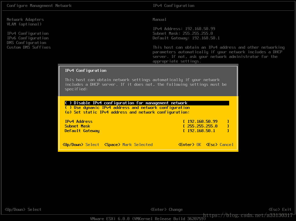 13. 重啟網(wǎng)絡(luò)配置,點(diǎn)擊Restart Management network選項,并點(diǎn)擊F11