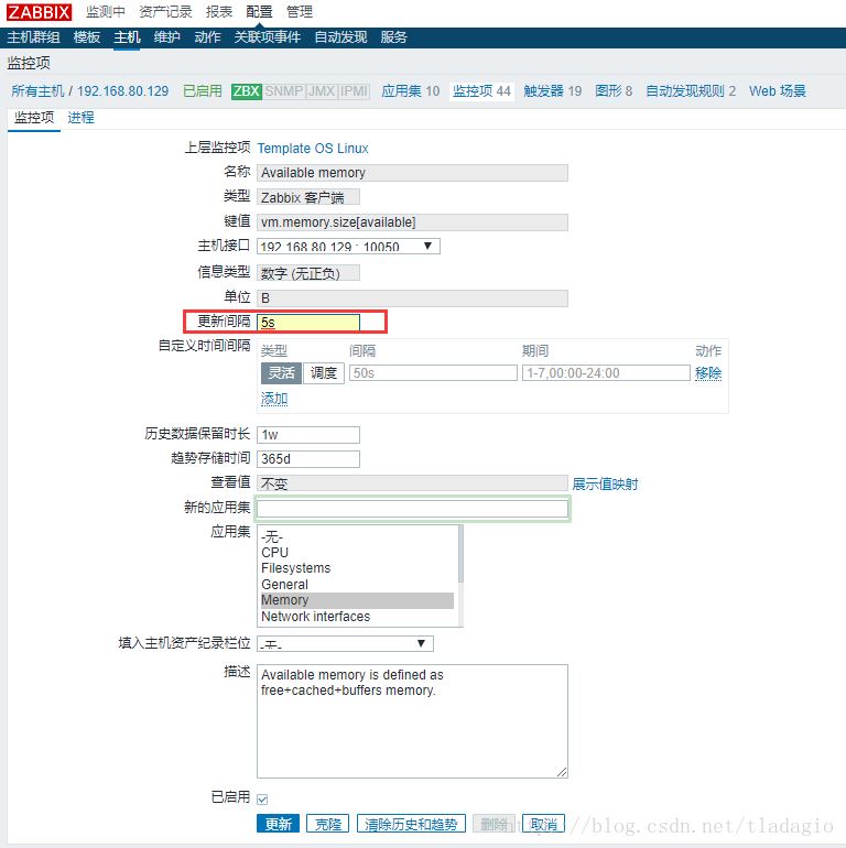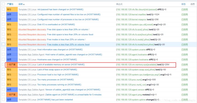 2)可以將zabbix自帶的模板中的對(duì)可用內(nèi)存的監(jiān)控中的觸發(fā)器的臨界值改為大于20,進(jìn)入模板列表