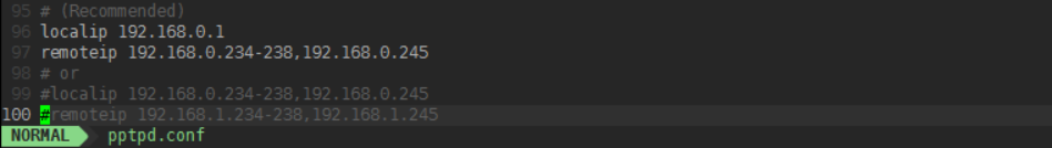 sudo vim /etc/pptpd.conf #如圖將96~97#去掉
