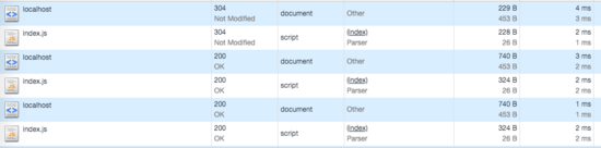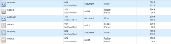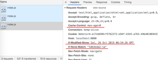 對照我的例子,我是這樣理解的: index.html 文件刷新頁面命中協(xié)商緩存返回了 304,而 js 文件是在 index.html 文件中鏈接引入的,所以命中強緩存 200 OK (from cache) 。為了驗證我的想法,我用在地址欄直接訪問了 index.js 文件。地址欄鍵入:localhost:8080/index.js,此時的確是返回了 304 給我了,在來看一下此時的請求頭: