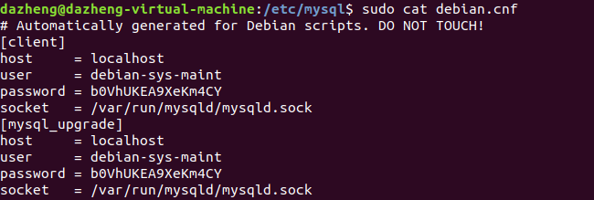 第一步:進入目錄:cd /etc/mysql,查看debian.cnf文件