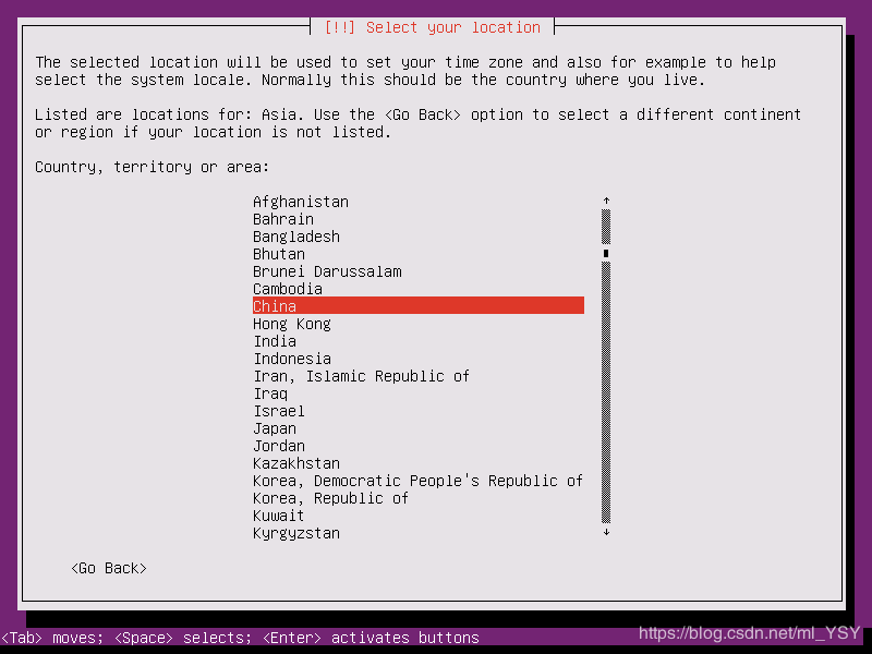 此時(shí),選擇的是所在洲,我是中國(guó)的所以選亞洲(Asia),然后你將看到第3幅圖中的China,選中它,然后回車(chē)(enter)此時(shí)要按兩次;
