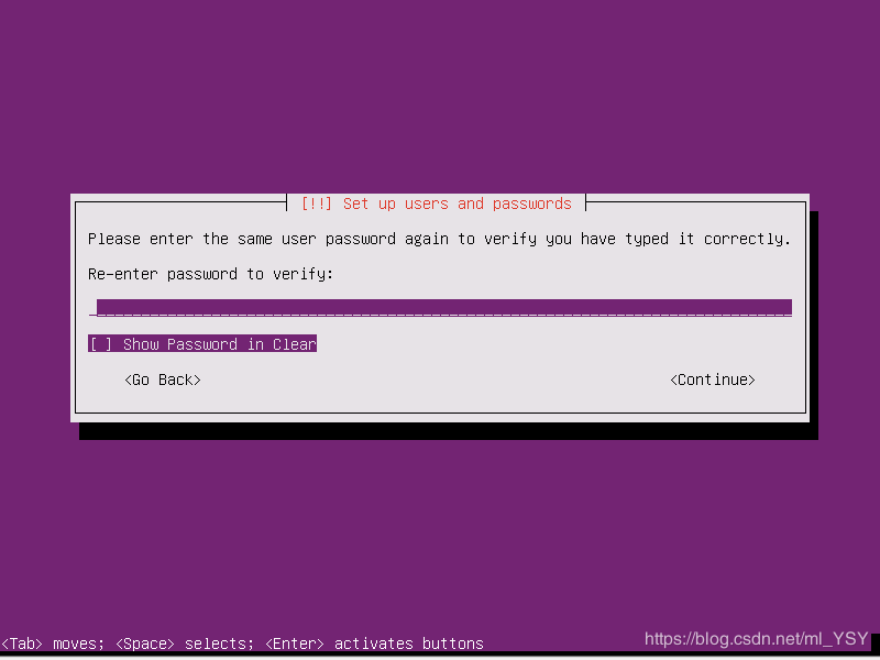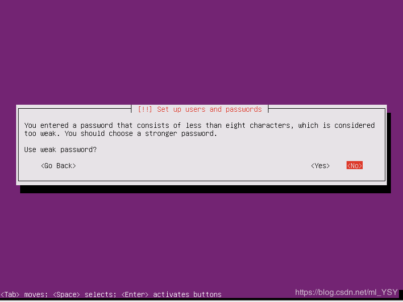 這里說(shuō)你的密碼太短或者太簡(jiǎn)單請(qǐng)重新輸入,這選擇yes就行了,然后下一個(gè)頁(yè)面按enter就行了,那個(gè)頁(yè)面我沒(méi)有截圖,注意一下。