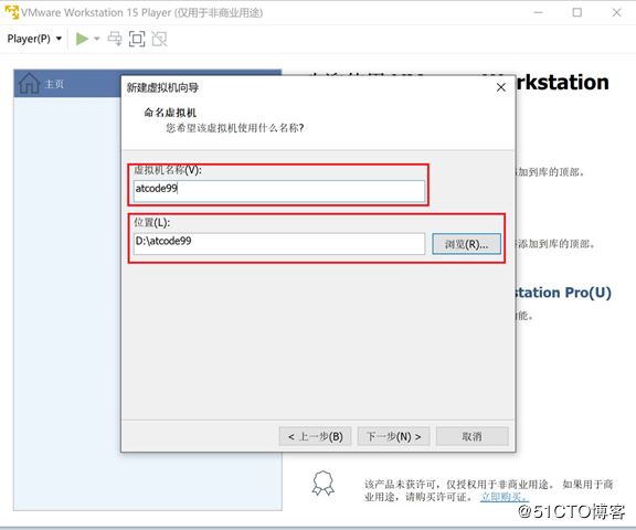 2.4:命名虛擬機(jī),指定虛擬機(jī)名稱和位置,按照自己的實(shí)際情況填充,本人的是atcode99