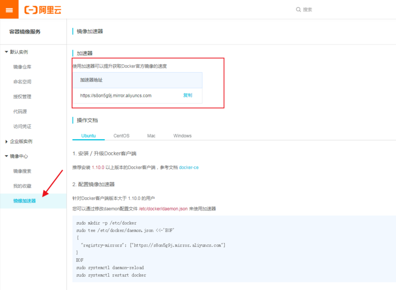 如果有阿里云用戶的同學(xué)可以直接去阿里云獲取加速器地址,如果沒有的話可以找一些國內(nèi)免費(fèi)加速。