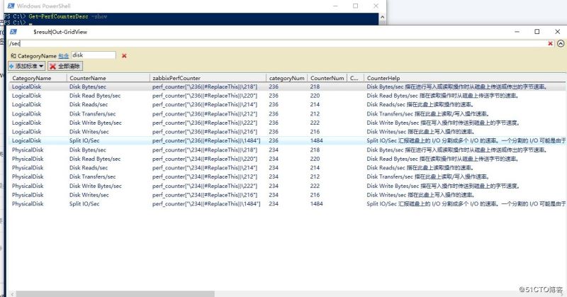 新起一個powershell ,直接敲Get-PerfCounterDesc -show, 可以對結(jié)果進行各種過濾。其中zabbixPerfCounter 列,就是生成的zabbix 上使用的key,其中的{#replaceThis} 請?zhí)鎿Q成計數(shù)器的實例名稱。比如_total.