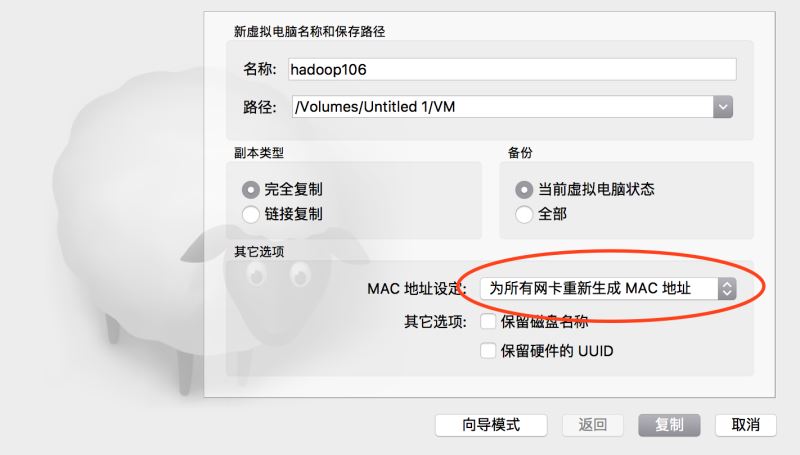 然后我們需要由上次配好的這一臺虛擬機,復(fù)制出來多臺,以便形成一個集群。首先關(guān)閉虛擬,在上面點右鍵,選復(fù)制,出現(xiàn)如下對話框,我選擇把所有網(wǎng)卡都重新生成Mac地址,以便模擬完全不同的計算器環(huán)境。