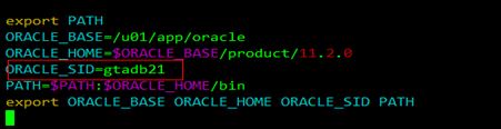 ORACLE_BASE=/u01/app/oracleORACLE_HOME=$ORACLE_BASE/product/11.2.0ORACLE_SID=gtadb21PATH=$PATH:$ORACLE_HOME/binexport ORACLE_BASE ORACLE_HOME ORACLE_SID PAT