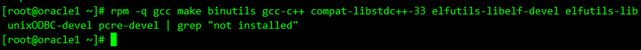 [root@oracle1 ~]# rpm -q gcc make binutils gcc-c++ compat-libstdc++-33 elfutils-libelf-devel elfutils-libelf-devel-static ksh libaio libaio-devel numactl-devel sysstat unixODBC unixODBC-devel pcre-devel | grep "not installed"