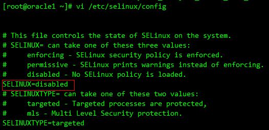[root@ORACLE1 ~]# vi /etc/selinux/config //關(guān)閉SELinux