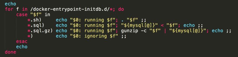 已經(jīng)設(shè)定了ENTRYPOINT,里面會調(diào)用/entrypoint.sh這個腳本,我們把mysql:8這個鏡像pull到本地,再用docker run啟動起來,看看里面的entrypoint.sh這個腳本的內(nèi)容,有一段內(nèi)容就是從固定目錄下遍歷所有的.sh和.sql后綴的文件,然后執(zhí)行,如下圖: