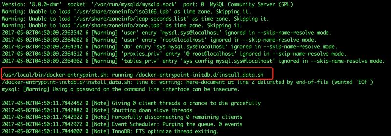 再執(zhí)行docker run –name mysqldisconf -e MYSQL_ROOT_PASSWORD=123456 -idt disconf_mysql:0.0.1啟動一個容器,再執(zhí)行docker logs -f mysqldisconf查看容器日志,如下圖紅框,可以看到我們寫入指定位置的sh文件已經(jīng)被執(zhí)行了: