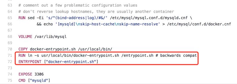 其實(shí)mysql的官方鏡像是支持這個能力的,在容器啟動的時候自動執(zhí)行指定的sql腳本或者shell腳本,我們一起來看看mysql官方鏡像的Dockerfile,如下圖: