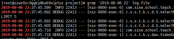 有些時(shí)候我們也會(huì)遇到一些希望查看某個(gè)時(shí)間段日志信息的需要,這個(gè)時(shí)候可以利用grep這條命令來(lái)實(shí)現(xiàn)這個(gè)功能,例如說(shuō)希望查看2019-08-06 22點(diǎn)這一個(gè)小時(shí)以內(nèi)的日志信息,那么可以輸入以下命令: