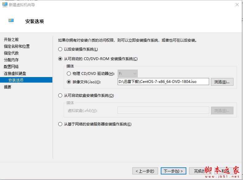 5、最后一步【安裝選項(xiàng)】,選擇下載到本地的CentOS系統(tǒng)映像即可: