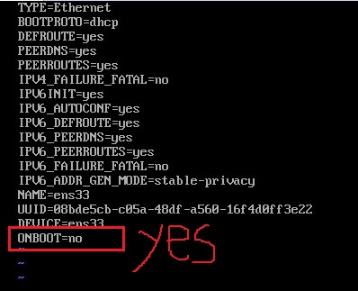4.若查不到ip,則查看ens33網(wǎng)卡的配置,輸入vi /etc/sysconfig/network-scripts/ifcfg-ens33(vi后加空格)