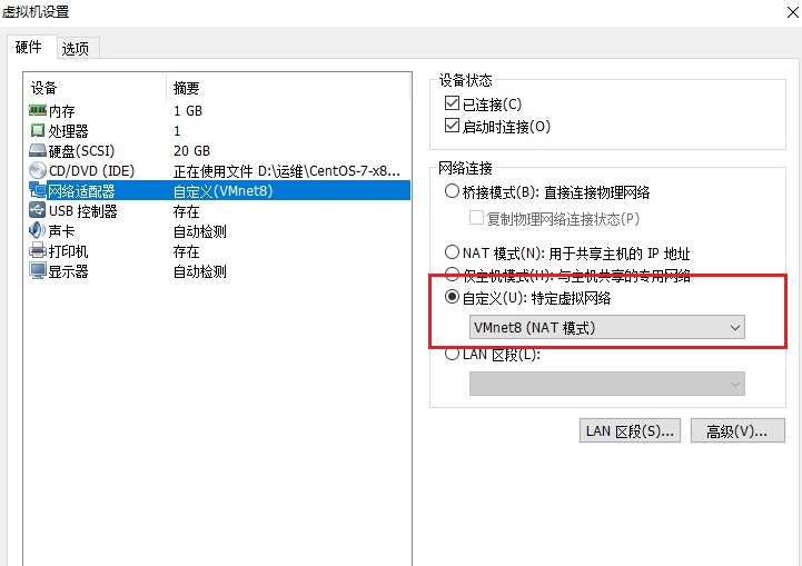 2.打開(kāi)虛擬機(jī)設(shè)置,網(wǎng)絡(luò)適配器中的網(wǎng)絡(luò)連接選擇自定義VMnet8(NAT模式)