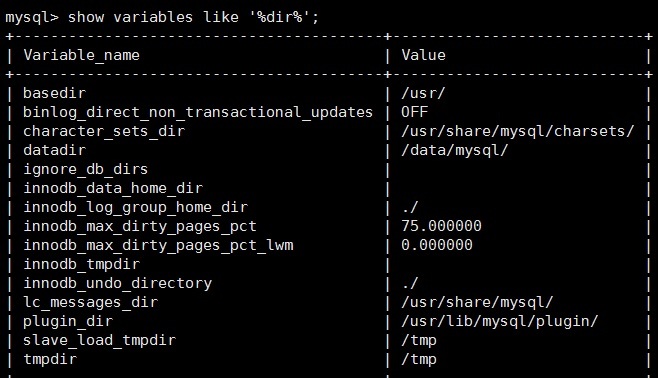 mysql>show variables like '%dir%'; <==當(dāng)顯示datadir 為/data/mysql時,修改成功