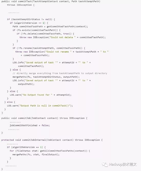 問(wèn)題就出在了 Hadoop 2.x 的 FileOutputCommitter 實(shí)現(xiàn)FileOutputCommitter 里面有兩個(gè)值得注意的方法:commitTask 和 commitJob。在 Hadoop 2.x 的FileOutputCommitter 實(shí)現(xiàn)里面,mapreduce.fileoutputcommitter.algorithm.version 參數(shù)控制著 commitTask 和 commitJob 的工作方式。具體代碼如下(為了說(shuō)明方便,我去掉了無(wú)關(guān)緊要的語(yǔ)句,完整代碼可以參見(jiàn) FileOutputCommitter.java):