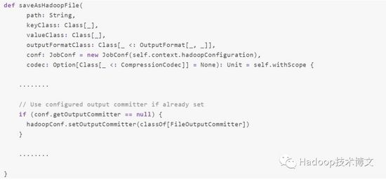 Spark 2.x 用到了 Hadoop 2.x,其將生成的文件保存到 HDFS 的時(shí)候,最后會(huì)調(diào)用了 saveAsHadoopFile,而這個(gè)函數(shù)在里面用到了 FileOutputCommitter,如下: