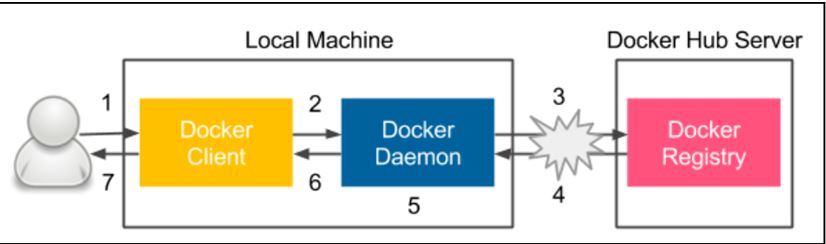 3.Docker守護(hù)進(jìn)程檢查它是否在本地包含hello-world映像,因?yàn)樗鼪]有,所以從遠(yuǎn)程Docker Hub注冊(cè)中心請(qǐng)求hello-world映像。
