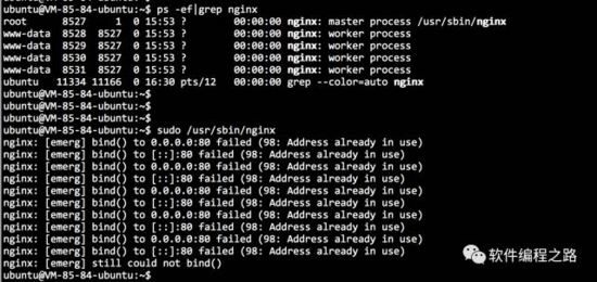 為了驗證nginx平滑重啟,筆者首先嘗試nginx啟動的情形下再次開啟一個新的server實例,結(jié)果如圖: