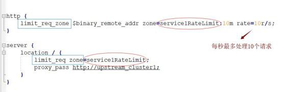 - zone:定義共享內(nèi)存區(qū)來存儲(chǔ)訪問信息, myRateLimit:10m 表示一個(gè)大小為10M,名字為myRateLimit的內(nèi)存區(qū)域。1M能存儲(chǔ)16000 IP地址的訪問信息,10M可以存儲(chǔ)16W IP地址訪問信息。