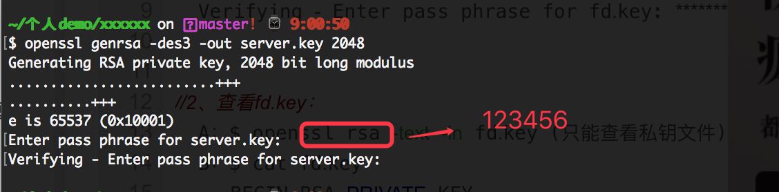如上:des3 是算法,2048位強度(為了保密性)。 server.key 是密鑰文件名 -out的含義是:指生成文件的路徑和名稱。