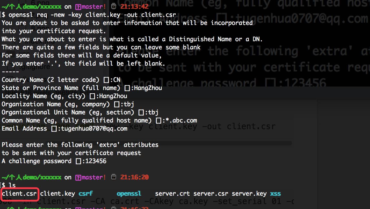 A challenge password []:123456 // 你的證書密碼,如果不想設(shè)置密碼,可以直接回車